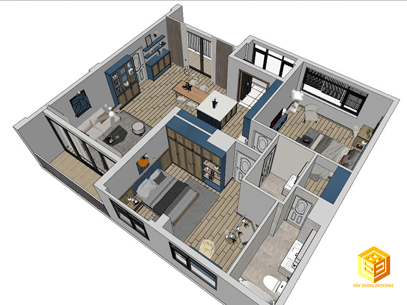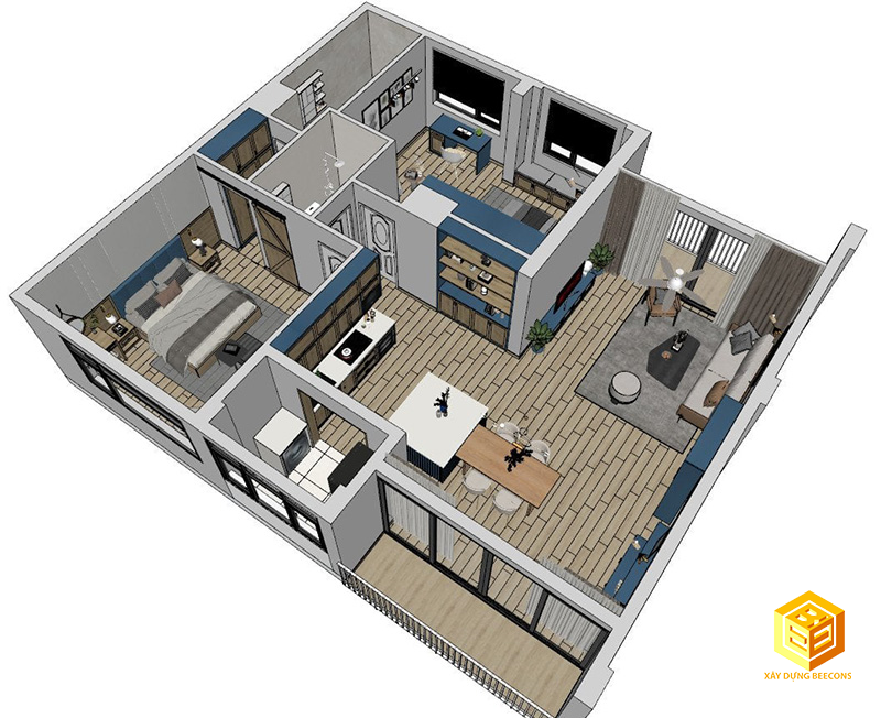 Căn hộ gồm có 2 phòng ngủ với đầy đủ tiện nghi, không gian rộng và thoáng. Tất cả các phòng đều có góc view đẹp là lợi thế của căn hộ này. Với yêu cầu của gia chủ mong muốn có một không gian mang màu sắc thiên nhiên nhưng phải hài hòa về tổng thể màu sắc trong căn hộ. Do đó, Beecons đã gửi đến cho vợ chồng anh Trí, chị Hạnh mẫu thiết kế nội thất căn hộ 2 phòng ngủ với cách bày trí ngăn nắp, trẻ trung, phù hợp với gia đình chị.