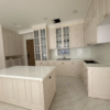 Phòng bếp thiết kế dạng chữ I kết hợp với bếp đảo và bàn ăn lớn tạo một không gian bếp đầy đủ tiện nghi.