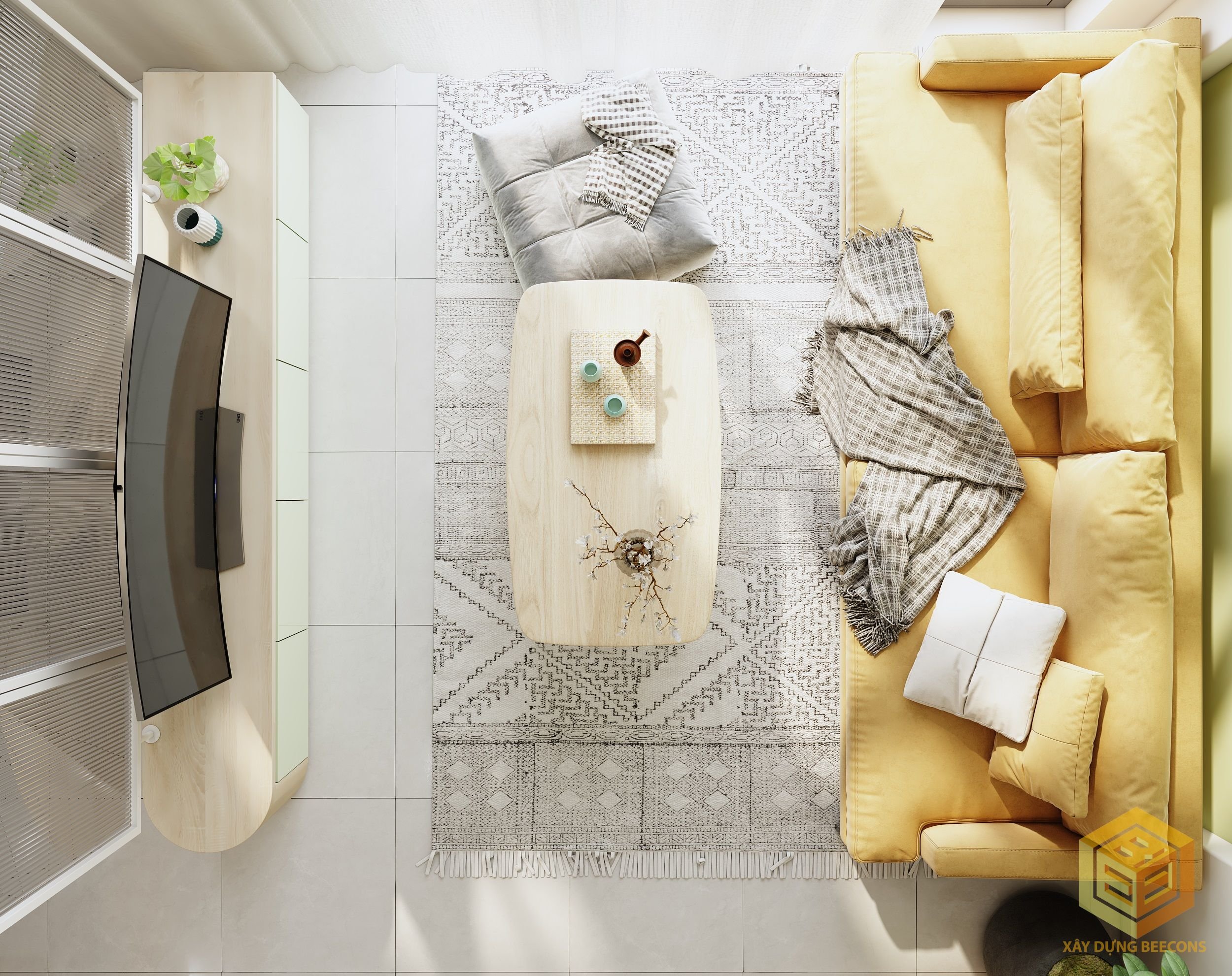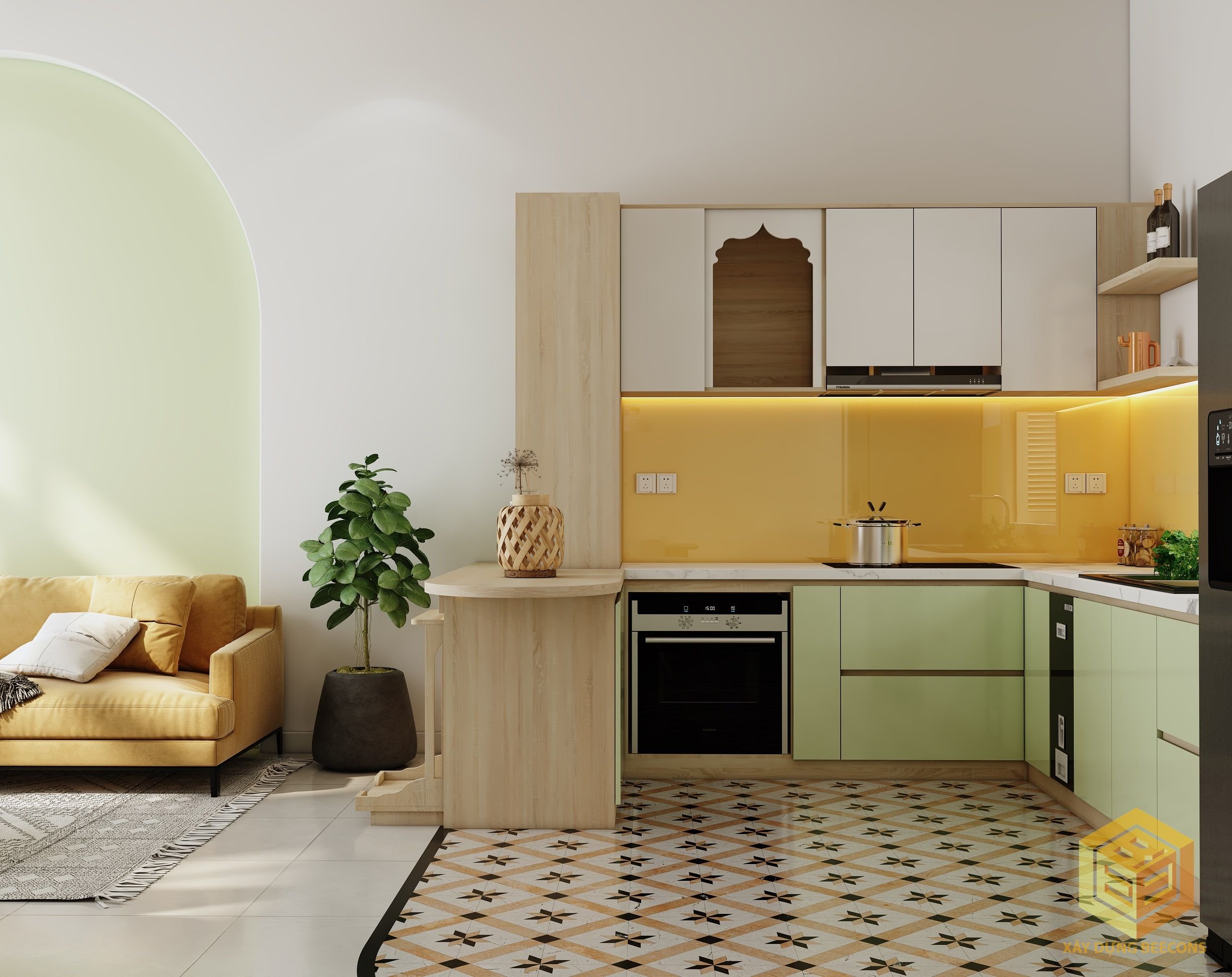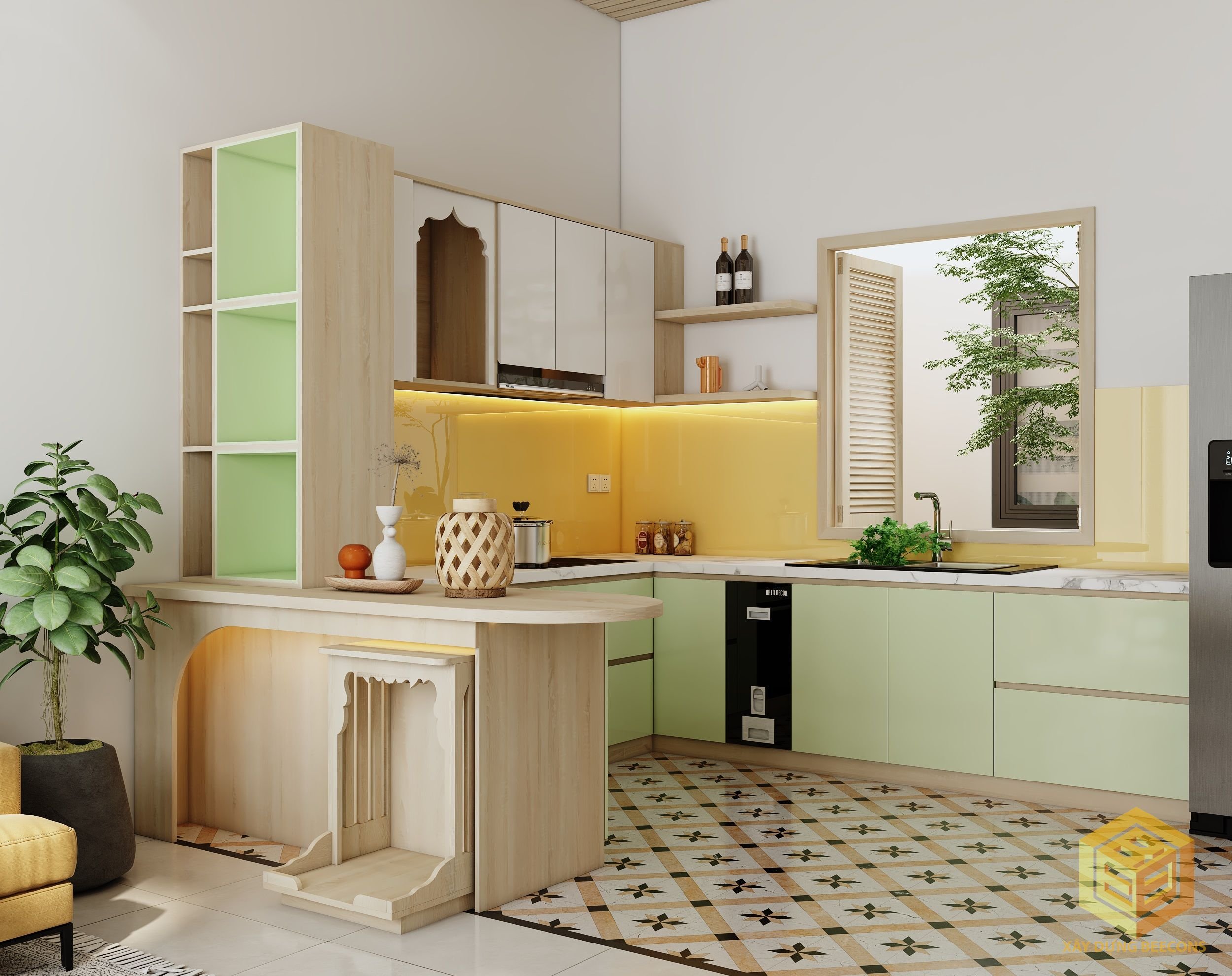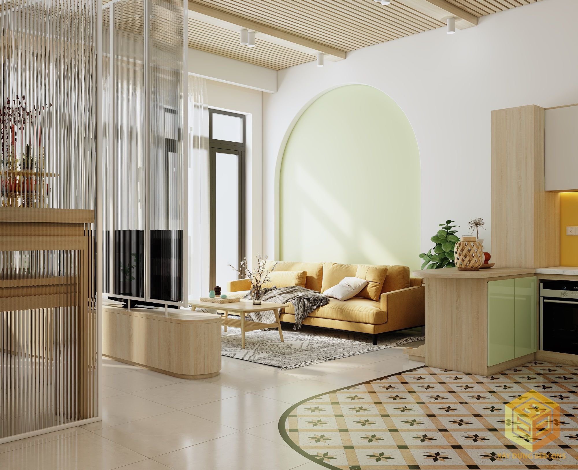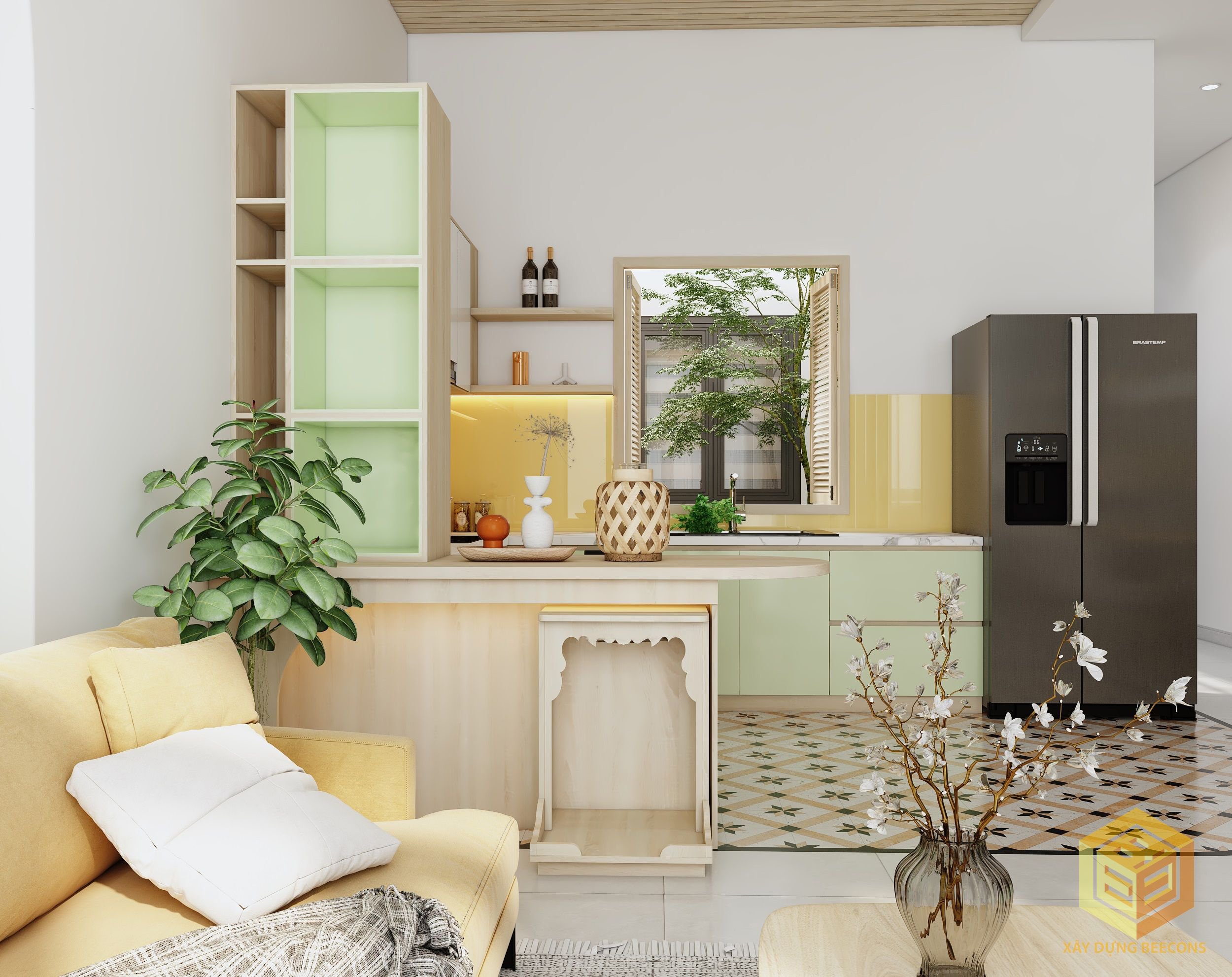– Vị trí bếp kết hợp phòng khách thay cho bếp nằm sau nhà.