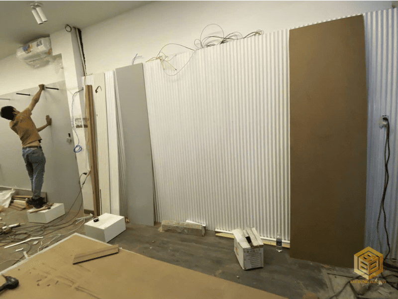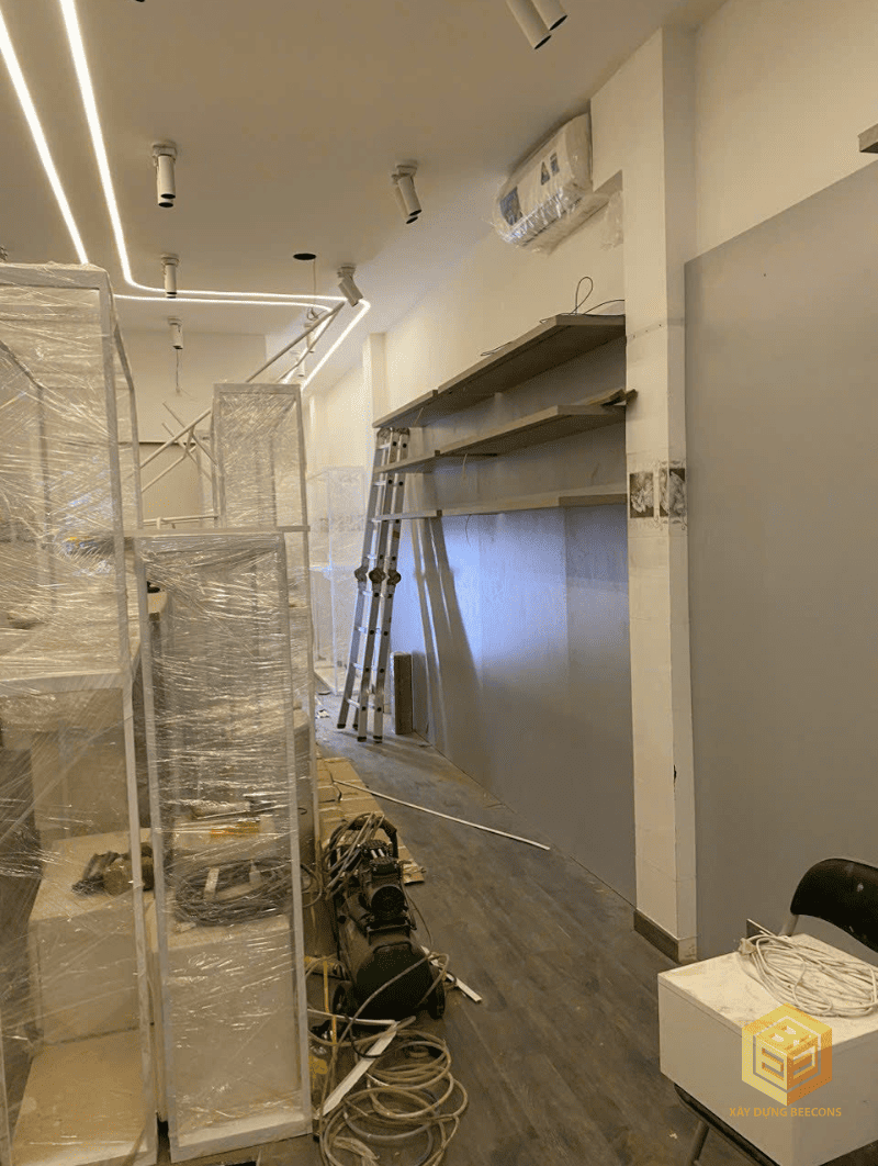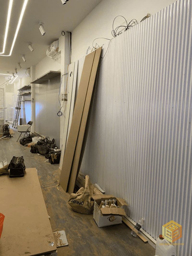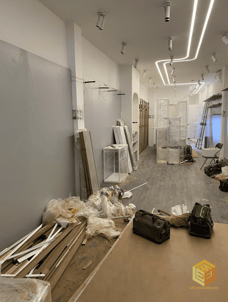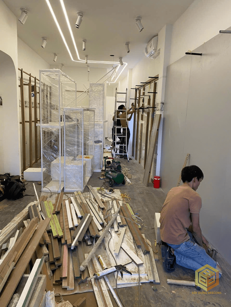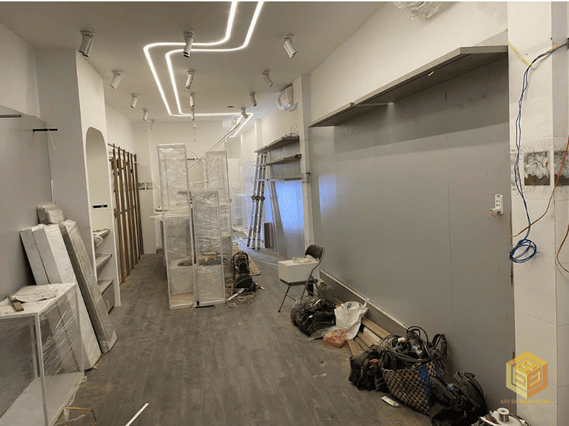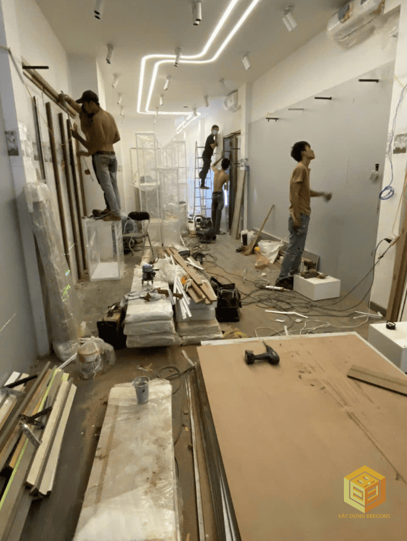 - Phần thô: Tháo dỡ tầng trệt, chống thấm vách sông và WC, đóng trần thạch cao mới + vách ngăn thạch cao, bã bột sơn trần + tường vách, thi công hệ thống đèn điện, thi công mặt tiền bảng hiệu.