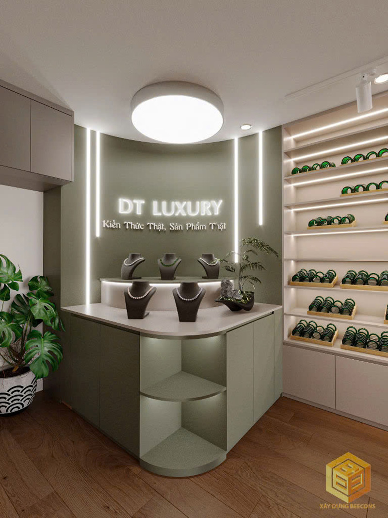 - Khu vực tủ trưng bày: Kệ tủ với các ngăn rộng rãi, màu sắc hiện đại, phù hợp để sắp xếp sản phẩm gọn gàng và thu hút.