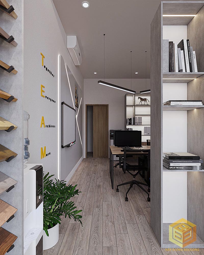 Hệ thống kệ sách và lưu trữ được thiết kế thông minh với nhiều ngăn, vừa giúp lưu trữ tài liệu gọn gàng, vừa là điểm nhấn trang trí cho văn phòng.